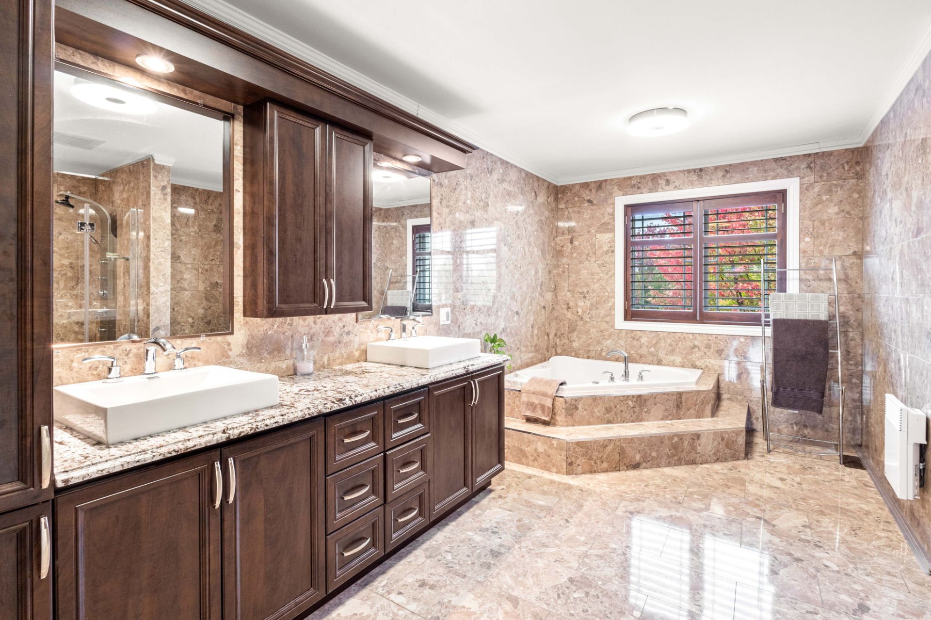 - 2 primary bedrooms upstairs, each with an ensuite
