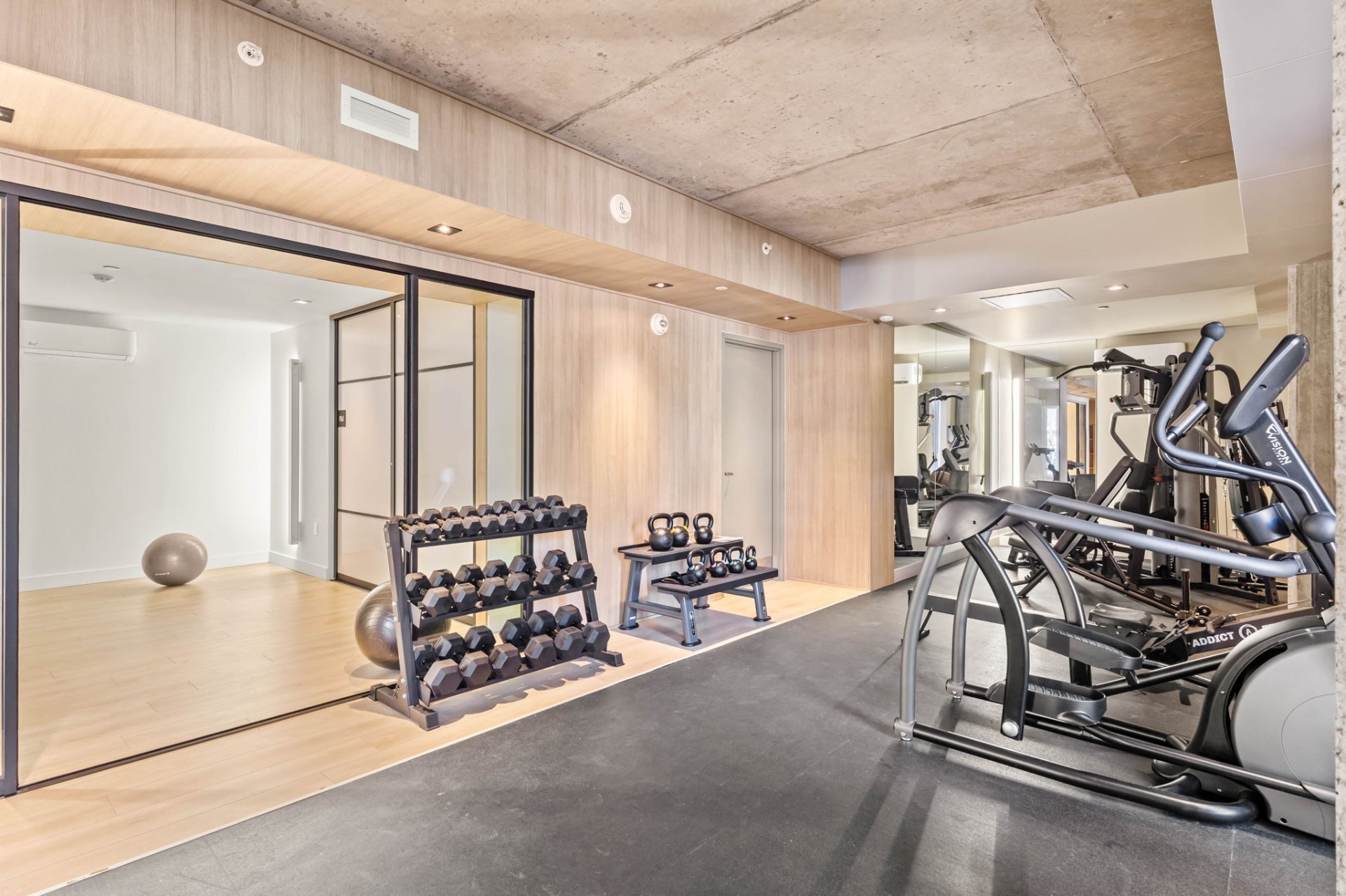 equipped fitness room, yoga studio, designer lounge with